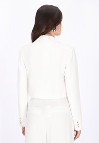 Žena s dlouhými vlnitými vlasy v bílém krátkém blejzru a kalhotách s vysokým pasem, nosí černý krajkový top a zlaté kruhové náušnice, ruka v kapse.