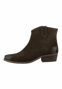 Černé semišové kotníkové boty s mírně špičatou špičkou, zipovým uzávěrem, zakřivenými švy a stohovaným podpatkem.