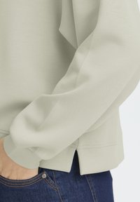 Usmívající se žena v lehce béžové mikině s výstřihem do V a tmavě modrých džínách, ruce volně sepnuté v pase před jednobarevným pozadím.