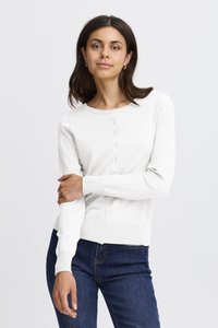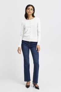 Žena s tmavými vlasy, oblečená v bílém zapínacím svetru a modrých džínách, stojící se založenou jednou rukou přes tělo.