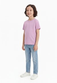 Dítě se středně dlouhými tmavými vlasy usmívající se, oblečené v světle fialovém tričku s krátkým rukávem, světle modrých džínách a bílých teniskách, stojící.