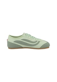 Světlounce zelená nízká teniska s semišovými překryvy, designem vlny na straně, zavazováním na tkaničky a podrážkou z gumové pryže, zobrazená z vnější strany.