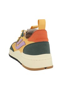 Nízký tenisk s žlutou síťovinou, tmavě zelenými překryvy, fialovými bočními pruhy, oranžovou patní záložkou a tlustou bílou podrážkou s černým vzorkem.