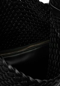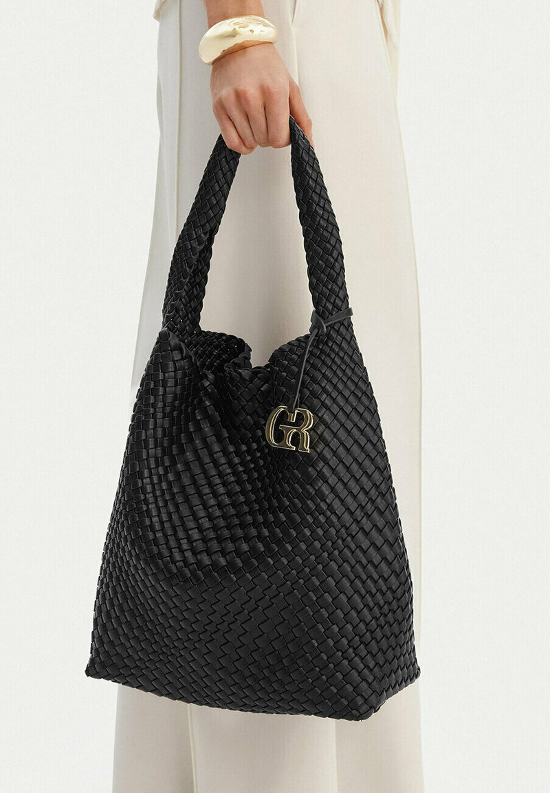 Ruka držící velkou černou tkanou koženou kabelku s očkovou rukojetí a zlatavým ozdobným přívěskem.