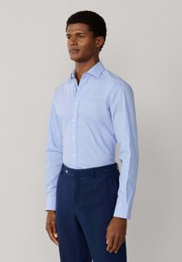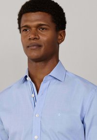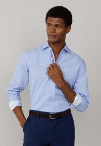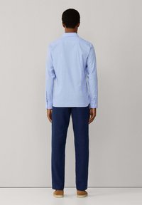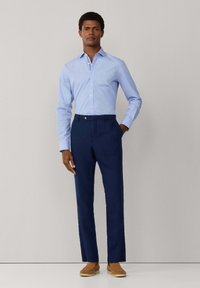 Muž v světle modré košili zapnuté na knoflíky, zastrčené do tmavě modrých kalhot, stojící s jednou rukou v kapse a dívající se stranou.