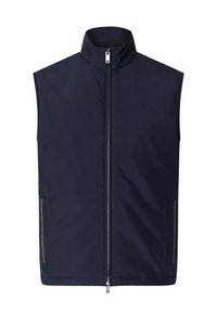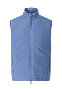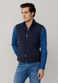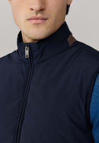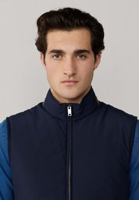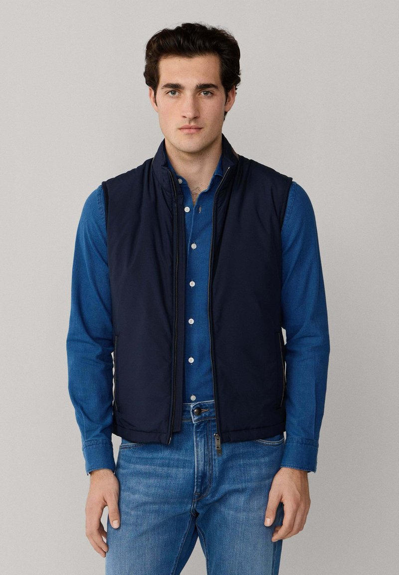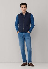 Mladý muž v tmavě modré vestičce na zip přes modrou košili s knoflíky a modré džíny, stojící před jednoduchým světlým pozadím.