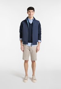 Mladý muž se usmívá, má na sobě tmavě modrou vestu na zip přes světle modrou pruhovanou košili a béžové kalhoty, stojící před jednobarevným bílým pozadím.