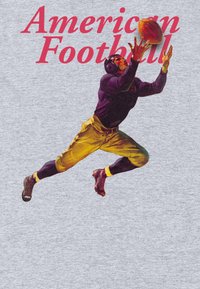 Šedé tričko s nápisem "American Football" a ilustrací fotbalového hráče v fialovo-žlutém dresu skákajícího za míčem.