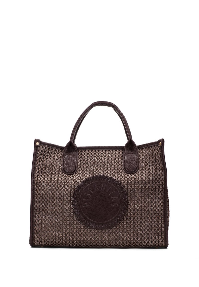 Hnědá tkaná taška přes rameno s tmavými koženými rukojeťmi a kulatou koženou nášivkou s ražbou "HISPANITAS" na přední straně.