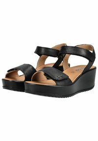 Černá kožená klínová sandála s nastavitelnými pásky na kotníku a vpředu, béžová stélka a texturovaná podrážka pro lepší přilnavost.