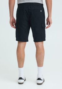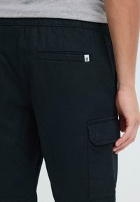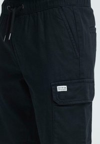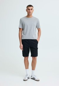 Muž v černých cargo kraťasech se stahovací gumou v pase, bílých ponožkách a bílých a černých teniskách stojící před bílým pozadím.