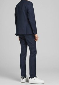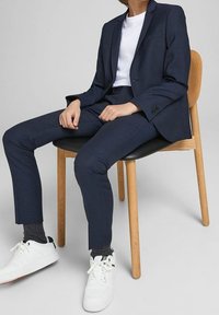 Tmavě modré kalhoty od obleku vyrobené z texturované látky, kombinované s bílými teniskami. Přiléhavý střih s zúženým střihem nohavic a jemnými detaily na kapsách.