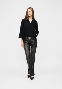 Žena v lehké černé blůze a tmavých kalhotách s kovovým vzhledem, doplněných černým opaskem s velkou stříbrnou přezkou ve tvaru srdce.