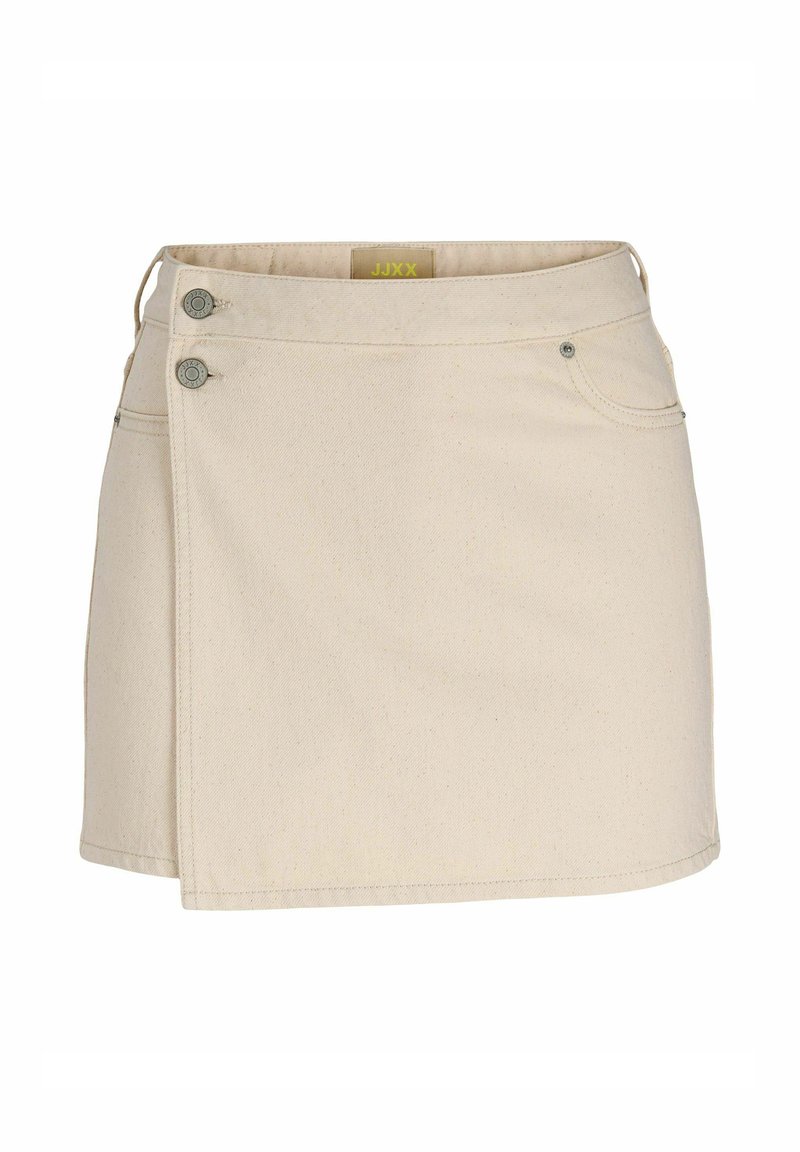 Béžová denimová sukně s překládaným designem, která má dva kovové knoflíky v přední části a jednu zadní kapsu. Texturovaná látka s jemným tkaním.