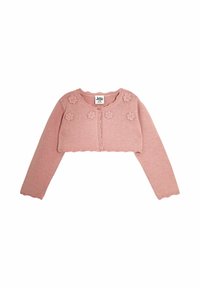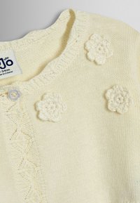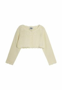 Krémově zbarvený krátký cardigan s dlouhými rukávy, květinovými pletenými ozdobami na přední straně a zapínáním na jeden horní knoflík.