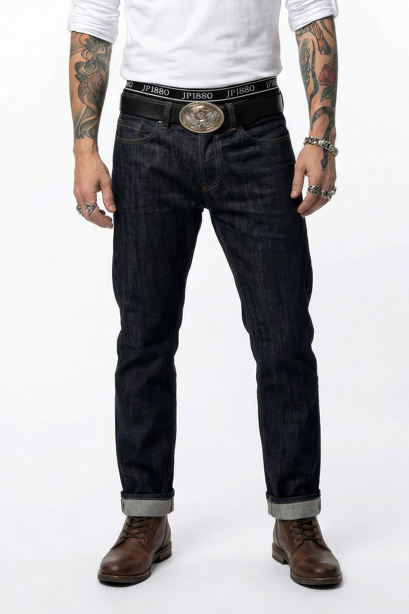 Muž v tmavých vyhrnutých džínách, hnědých kožených botách, bílé košili s dlouhým rukávem, černém opasku s pásem JP1880 a stříbrnou sponou s motivem orla.