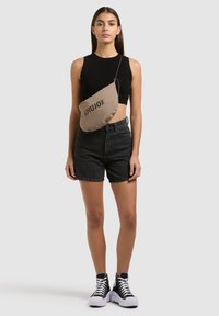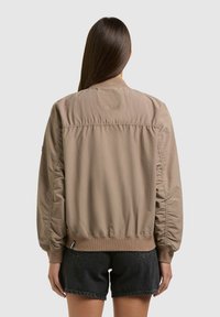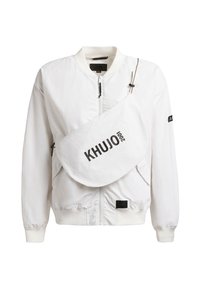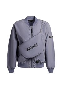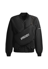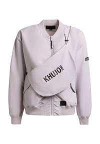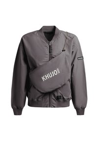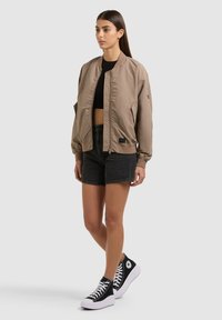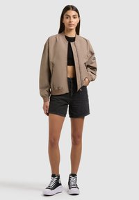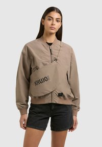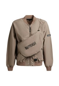 Žena v taupe bomber bundě a crossbody tašce s nápisem "KHUJO 2001" černou barvou, v kombinaci s černými džínovými šortkami, na jednobarevném pozadí.