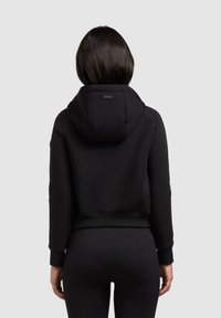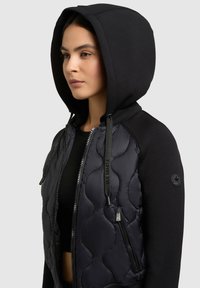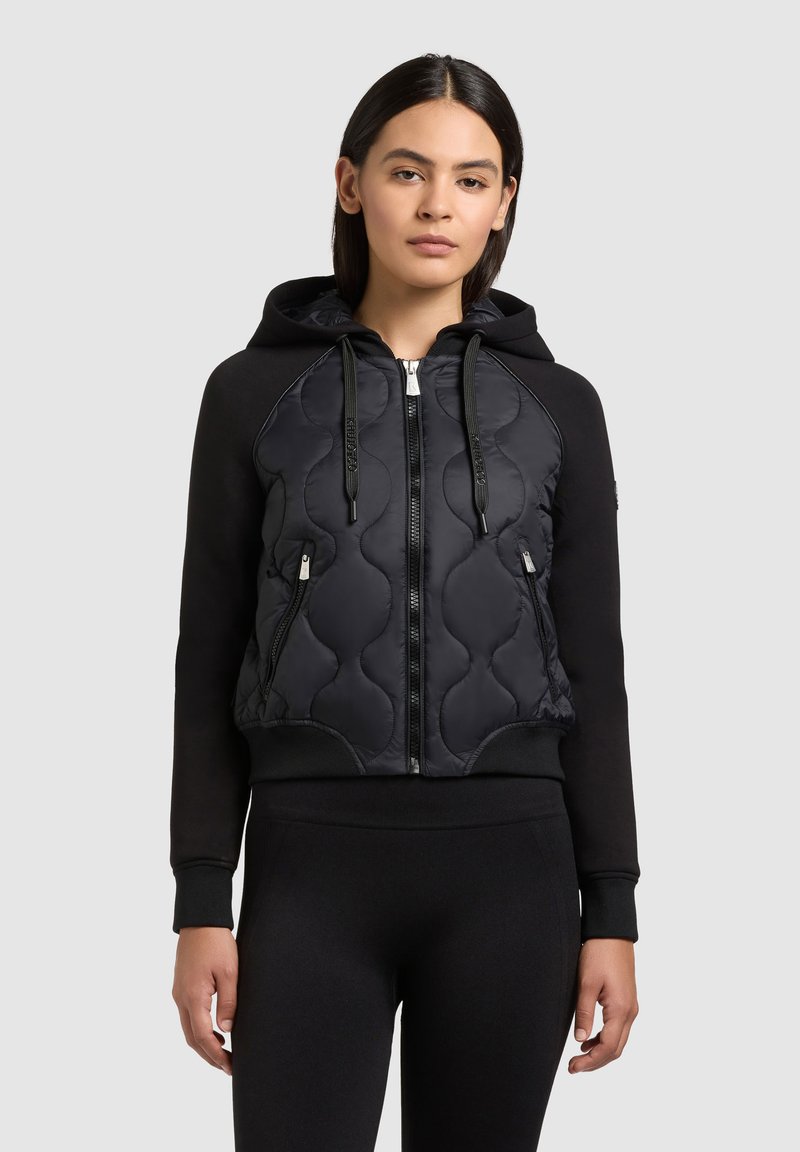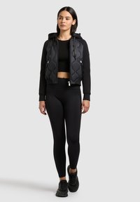 Žena nosící černou prošívanou mikinu na zip s kapsami vpředu a stahovacími šňůrkami, v kombinaci s černými legínami, stojící na světlém pozadí.
