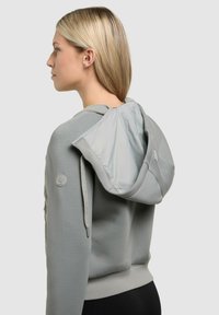 Mladá žena se světlými vlasy, oblečená v světle šedé prošívané mikině na zip a černých kalhotách, ruce v kapsách, dívá se mírně doprava.