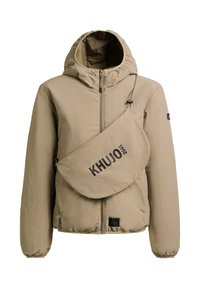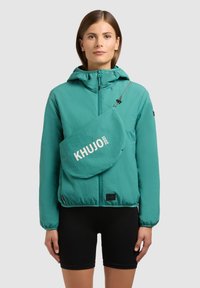 Žena oblečená v petrolejově modré bundě na zip s kapucí a odpovídající kabelkou přes rameno označenou značkou "KHUJO", v černých cyklistických šortkách, stojící na bílém pozadí.