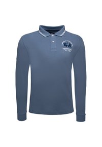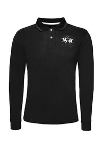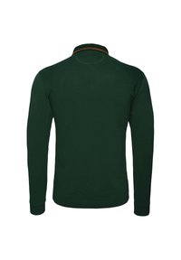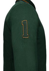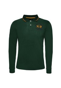Tmavě zelená dlouhá polo košile vyrobená z bavlny. Má límec s žlutými akcenty a vyšitým logem v žluté a fialové barvě.