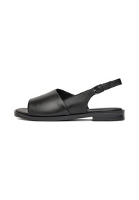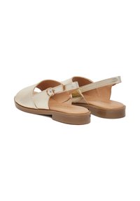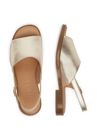 Zlaté metalické sandály s otevřenou špičkou, páskem přes patu a plochou podrážkou. Hladký povrch s minimalistickým designem. V kombinaci s bílými šaty.