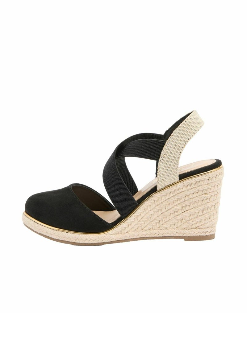 Černá sandála na klínku s béžovým copánkovým podpatkem, křížovými elastickými pásky a uzavřenou zaoblenou špičkou.