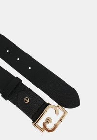 Černý kožený pásek s texturovaným povrchem a lesklou zlatou přezkou s výrazným logem. Nastavitelná délka a elegantní design.