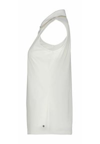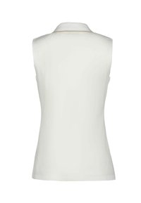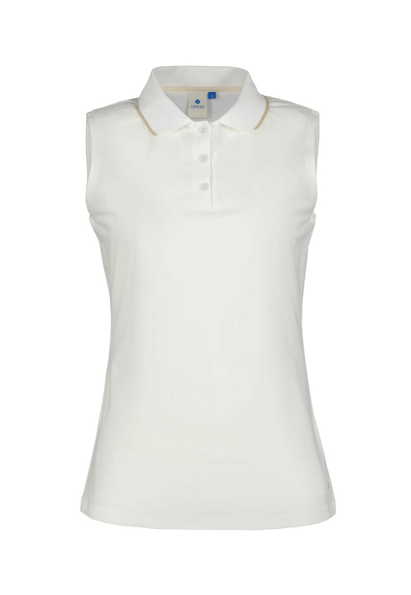 Bílé polo tričko bez rukávů se třemi knoflíky a béžovým lemováním kolem límce, vyrobené z hladké látky.