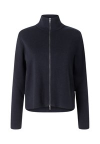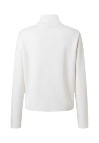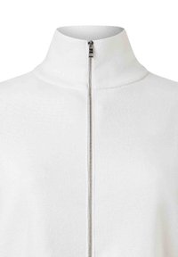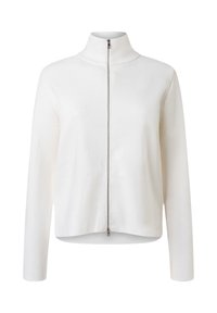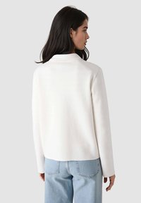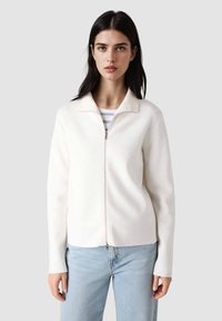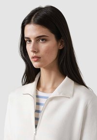 Žena s tmavými vlasy v bílém svetru na zip přes proužkované tričko a světle modré džíny stojící před jednoduchým světlým pozadím.