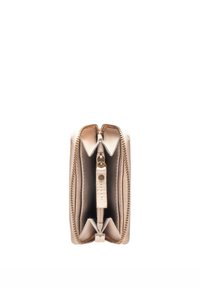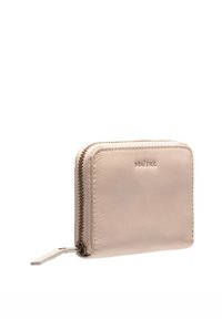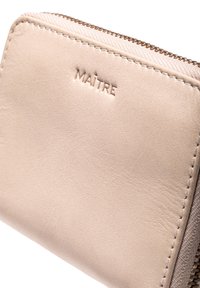 Béžová kožená peněženka na zip s vyraženým logem "MAÎTRE" a prošitými okraji, zavřená, zobrazená na bílém pozadí.
