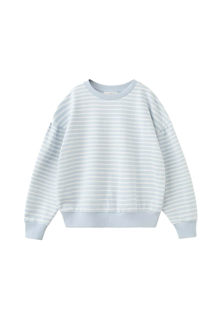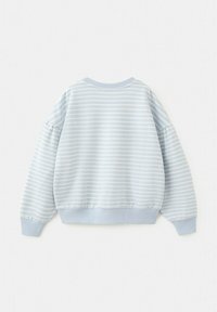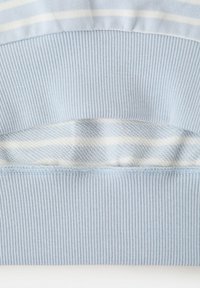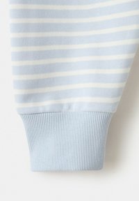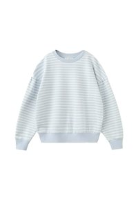 Světle modrá a bílá pruhovaná mikina s dlouhým rukávem, s žebrovanými lemy na manžetách, spodním okraji a kulatým výstřihem, na bílém pozadí.