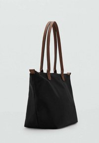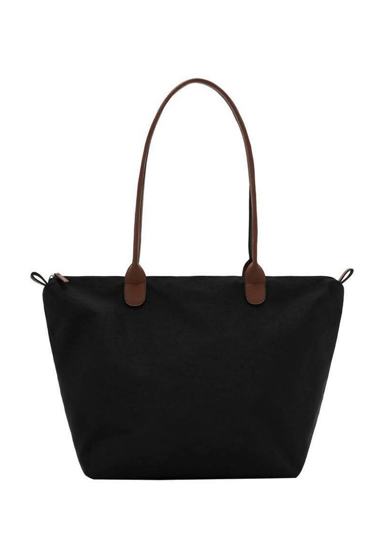 Černá plátěná taška přes rameno s hnědými koženými držadly a doplňky. Prostorná, měkká textura a vrchní zapínání na zip pro bezpečnost.