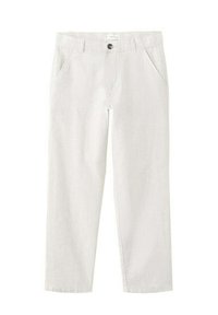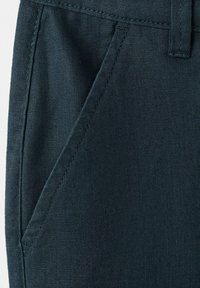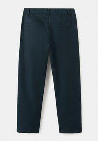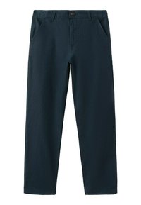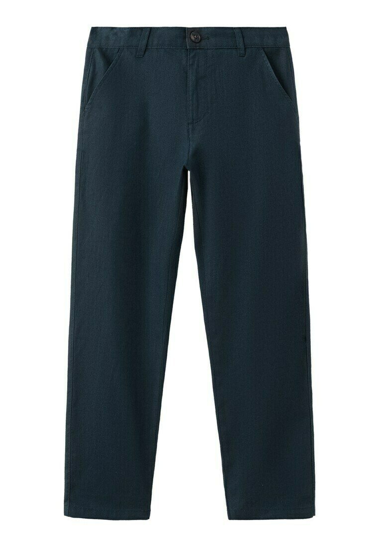 Tmavě modré kalhoty s rovnými nohavicemi, poutky na pásek, zapínáním na knoflík, předními kapsami a čistým, upraveným designem.