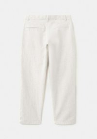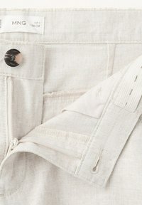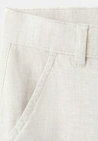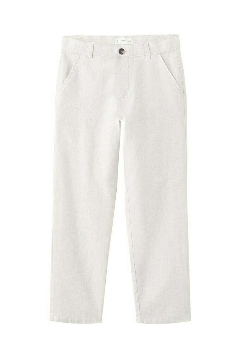 Světlé béžové lněné kalhoty s předními kapsami, poutky na pásek a zavíráním na knoflík, zobrazené na bílem pozadí.
