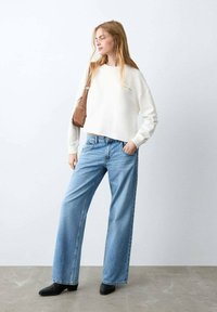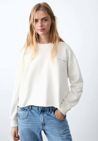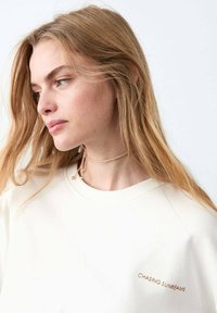 Bílá krátká mikina s grafikou zlatého slunce a textem "TRUE" na zádech, s volným střihem a měkkou texturou.