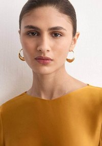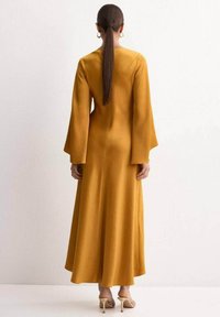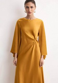 Žena modelující hořčicově žluté šaty s dlouhým rukávem, bočním uzlem a asymetrickým lemem, s náušnicemi ze zlata a otevřenými podpatky.
