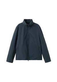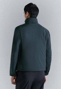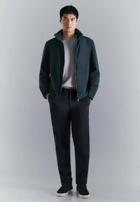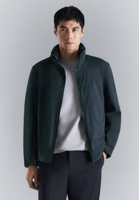 Muž oblečený v tmavě zelené bundě na zip přes světle šedé tričko a tmavé kalhoty, stojící před jednobarevným světle šedým pozadím.