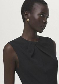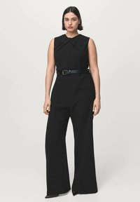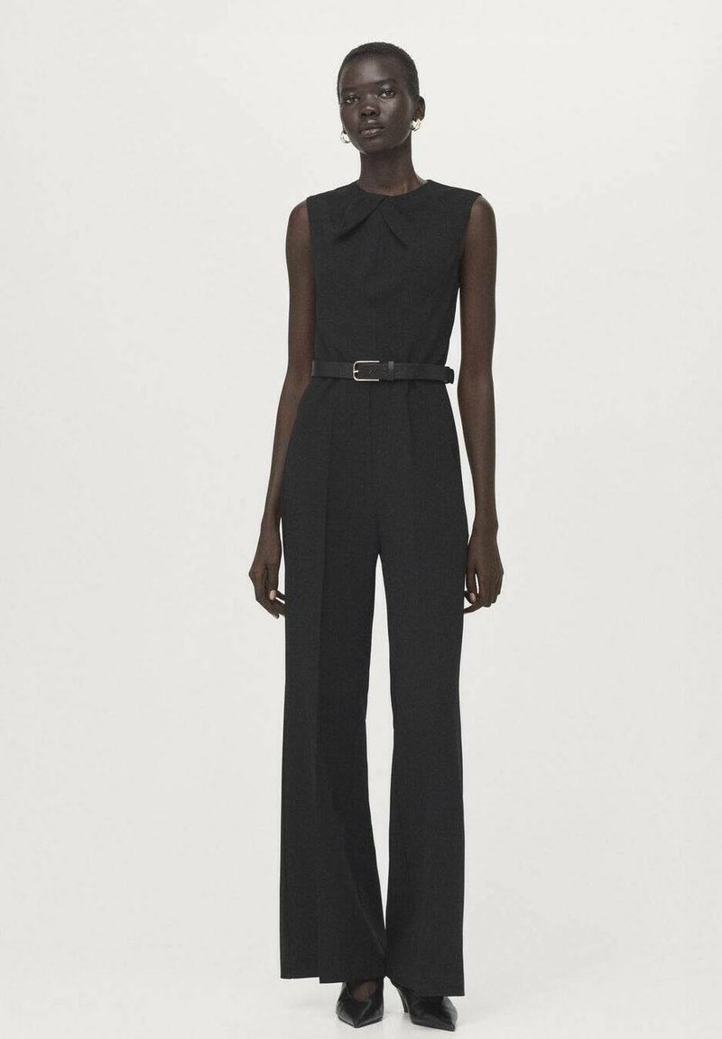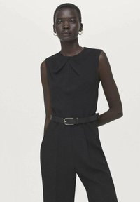 Černý overal bez rukávů s límečkem typu Peter Pan, páskem v pase, širokými nohavicemi a hladkou texturou látky. Elegantní a střihaný design.