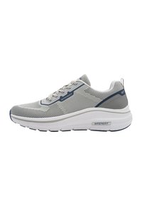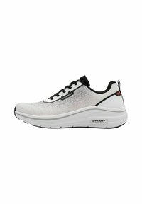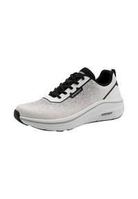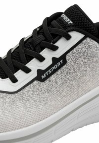 Světlé šedé a bílé sportovní boty s černými tkaničkami a detaily, tlustou polstrovanou podrážkou a značkou "MTSPORT" na boku a patě.