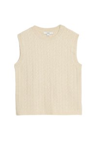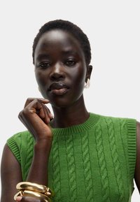 Zelený svetr bez rukávů s pleteným vzorem, ribbeným výstřihem a otvory pro ruce, s měkkým a ležérním designem.