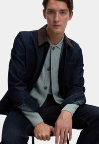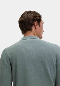 Svetle zelený žebrovaný kardigan s límcem, který má zapínání na knoflíky a dlouhé rukávy. Vyroben z měkkého pleteného materiálu.