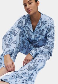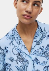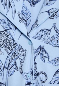 Světlomodrá sada pyžama s motivy listů a leopardího vzoru. Vyrobena z měkké látky; obsahuje halenku na knoflíky a kalhoty se širokými nohavicemi.