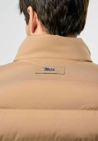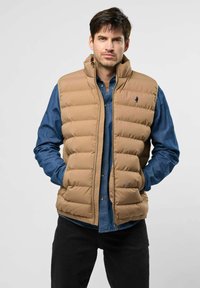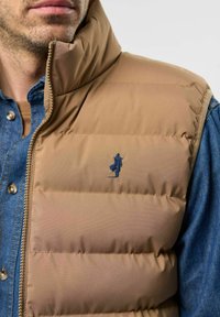 Béžová péřová vesta s vysokým límcem, zapínáním na zip a bočními kapsami, nošená přes modrou denimovou košili. Hladká textura, prošívaný design a logo detail.