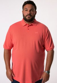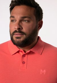 Korálová polokošile s klasickým límečkem, tříknoflíkovou légu, hladkou texturou a decentním logem na hrudi. Krátké rukávy.