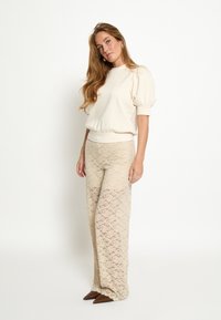 Žena s dlouhými blond vlasy, oblečená v krémovém topu s nafouklými rukávy a béžových kalhotách s květinovou krajkou, stojící před jednobarevným bílým pozadím.