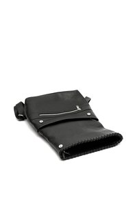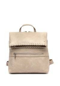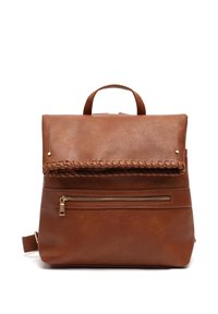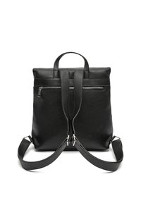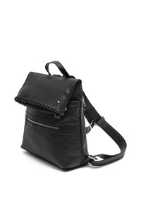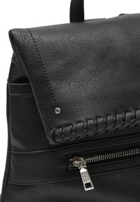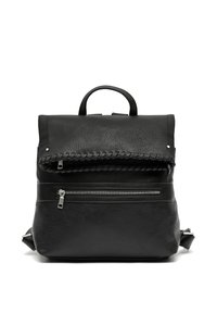 Černý batoh z umělé kůže s horním držadlem, proplétaným klopovým detailem, přední vodorovnou kapsou na zip a nastavitelnými ramenními popruhy.