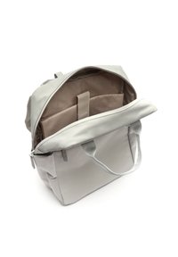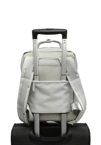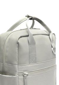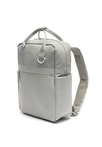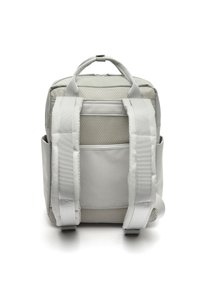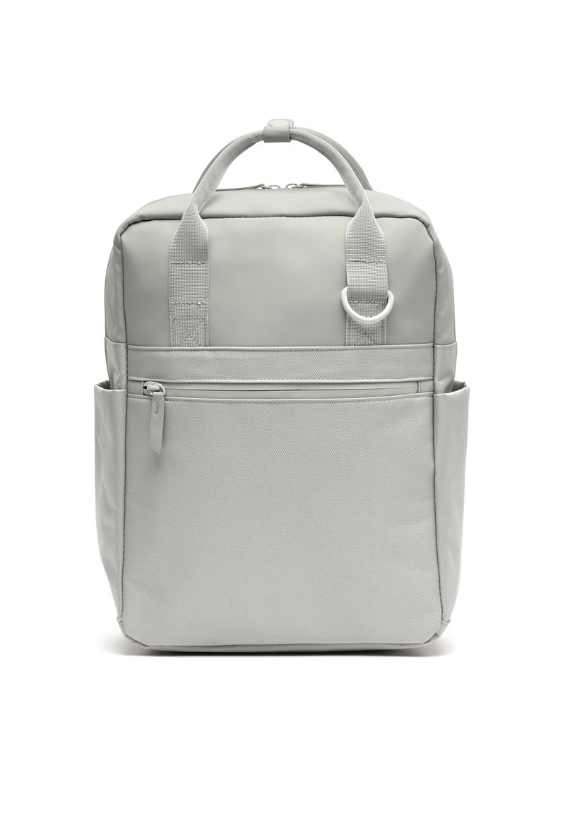 Světle šedý čtvercový batoh s horními madly, předním kapsou na zip, bočními kapsami a kovovým kroužkem na předním popruhu.