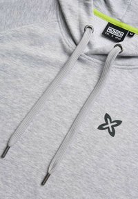 Šedá mikina s kapucí, klokáním kapsou, šňůrkami a malým černým logem na hrudi. Má žebrované manžety a lem.