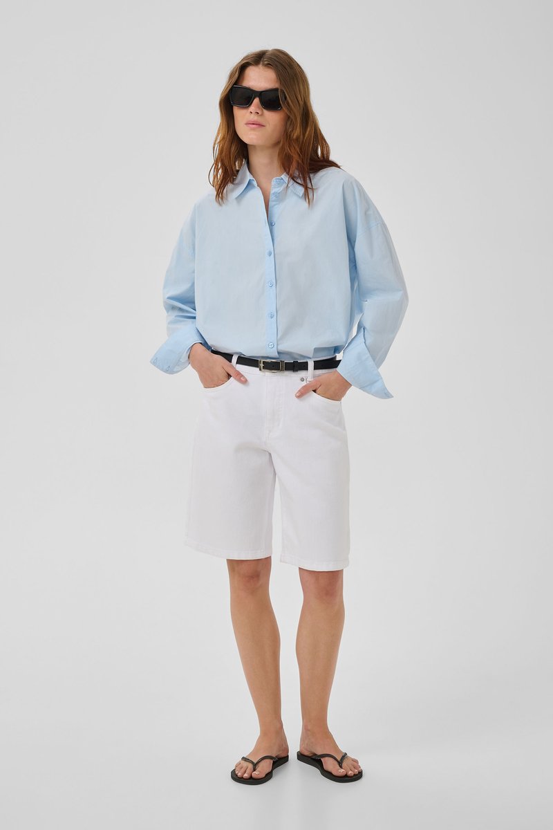 Žena v nadměrné světle modré košili na knoflíky, bílých šortkách ke kolenům s černým páskem, černých slunečních brýlích a černých žabkách.